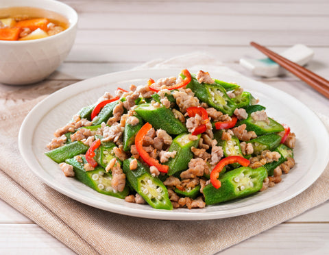 烹調步驟 鍋中煮滾水後,加入½茶匙特鮮雞粉,再加入秋葵略煮10秒,然後瀝乾。 中火燒熱油,加入豬肉炒勻,盛起備用。 於原鑊加入蒜蓉和薑蓉爆香,再加入秋葵、紅尖椒及豬肉炒勻。 加入調味料以大火快炒。