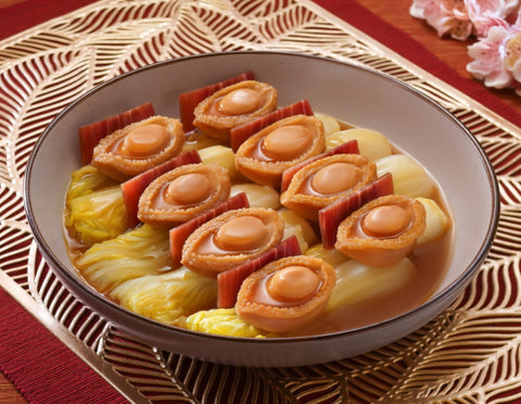 烹調步驟 將金華火腿用熱水浸3分鐘後瀝乾備用。 中火燒熱油,爆香薑片和蝦米,再加入清水和特鮮菇粉煮滾。 加入娃娃菜,以小火煮熟,將娃娃菜瀝乾放在碟上,並鋪上金華火腿。 煮熱金湯和鮑魚,將鮑魚放在娃娃菜上,再淋上鮑魚汁。